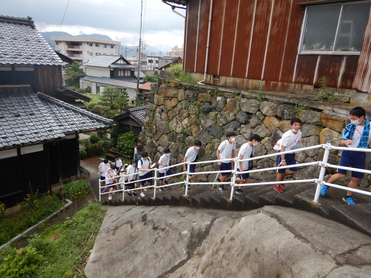 実は鯖江高校は鯖江断層の上にあります。生徒は起伏のある丘を毎日登校していたり、急斜面の下にあるグラウンドへ昇り降りするなど結構大変な地形なんです。