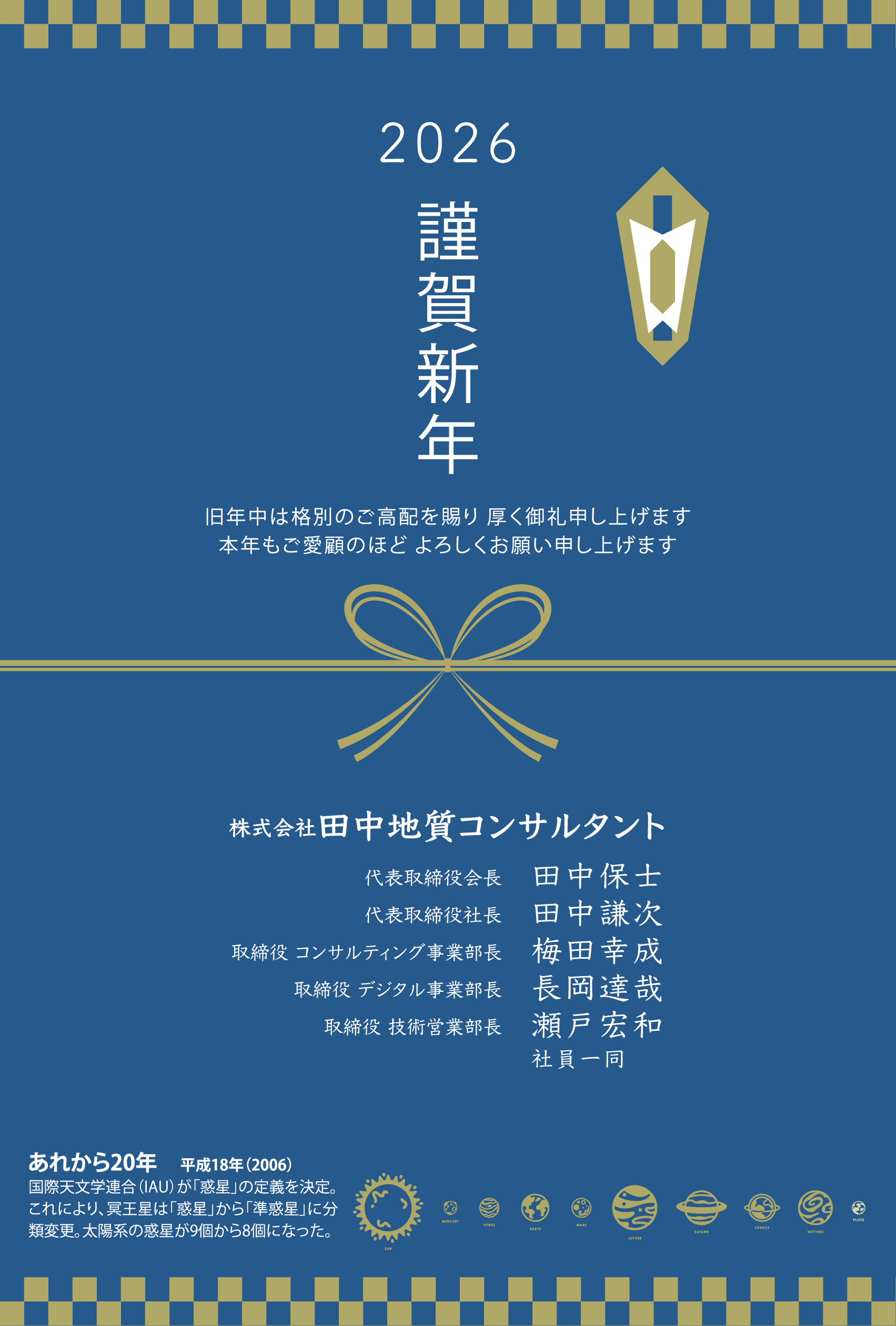 2026年 謹賀新年 投稿者: tgc2026年1月6日2026年1月6日ニュース 2026年 謹賀新年 本年もよろしくお願いいたします。 当社の新年は、お寺へ初お参りとご祈祷からスタートします。 一年の始まりを社員全員でご祈祷し、お祓いしていただいております。 無事故を目指すとともに、「人と大地を紡ぐ 最高のパートナーへ」向けて社員一同励んでまいります。 共有: クリックして X で共有 (新しいウィンドウで開きます) X Facebook で共有するにはクリックしてください (新しいウィンドウで開きます) Facebook いいね:いいね 読み込み中… 関連