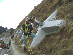 SAAM(Sustainable Asset Anchor Maintenance)システムとは、グランドアンカー工が施工されたのり面の維持管理に必要なアンカー緊張力等に関する調査を、小型・軽量なSAAMジャッキを用いることで、効率的かつ有効に行えるシステムです。