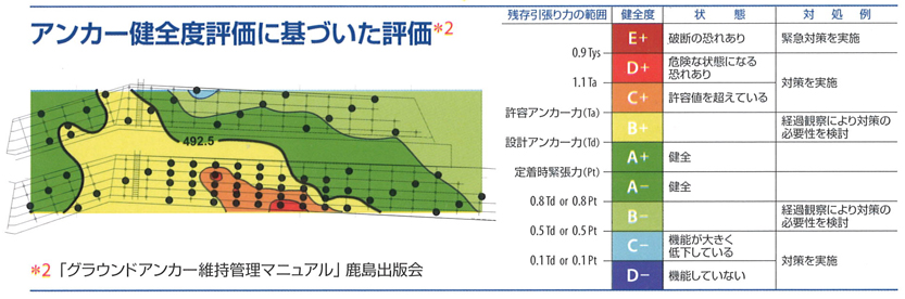 取得したデータより、のり面の緊張状態を面的に表現することで、メンテナンスすべきアンカーだけでなく、斜面全体の健全度の細かな状況を把握でき、メンテナンス予備群にも利用できます。