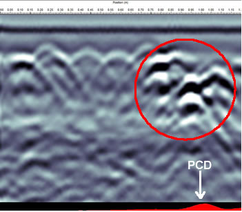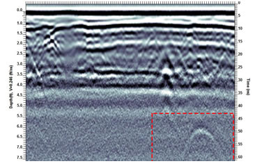 コンクリートと空気の電気的性質は大きく異なっており(比誘電率は9から1へ変化する)、空洞はGPRデータ上では強い反射としてあらわれます。コンクリート杭とコンクリート路盤には性質の違いはほとんど無いため、コンクリート杭と路盤が接触している場所では、反射は弱いか、境界面として検出されない状態となります。GPRは空洞調査に大変適した、安全・迅速に行えるで効果的な方法であり、この他にも滑走路調査や道路のメンテナンスなど様々な用途で威力を発揮します。