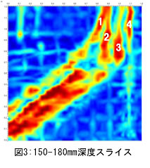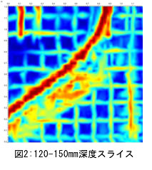 図2は深度約20cm付近のスライスで、コンクリート路盤内の鉄筋がはっきりと確認できます。