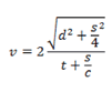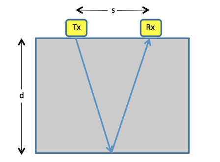 まず、供試体の底面には、供試体とまったく異なる電気特性を持った物質を設置します。特に金属板などが効果的です。また、GPRのアンテナと供試体の相性が良い場合、境界が明確に確認できます。送信電波が供試体の底面から反射して戻ってくるまでの時間(t)と、送・受信機の間隔(s)、真空中の光の速度(c)、そして供試体の深度(d)を図1の式に当てはめて速度を算出します。この際、信頼できる結果を導き出すには、多くのことを考慮しなければなりません。まず、計測された電磁波反射時間(t)が正確な速度を算出できるよう、また、サンプルのサイズが電磁波反射時間に影響を及ぼさないよう、サンプルは十分な大きさがなければなりません。