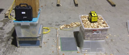 次の例は反射波をより明確に見分ける簡単な方法です。pulseEKKOPRO TR1000を使用し、ウッドチップを使ってデータの収集を行いました(図2)。一つはプラスチックコンテナの底に金属板を入れ、もう一つは何もいれずに(空気)行いました。