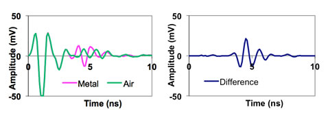 図3の左のグラフを見ると、両方のケースにおけるサンプルの底面からの反射を確認できますが、これだけで正確な電磁波反射時間を特定するのは困難です。右のグラフは二つのトレースの差を示していますが、これを見ると反射波の動きが明確になります。 この方法は、欲しい反射を見分けるのに工夫をこらして、より正確な到達時間を導き出し、結果としてより正確な伝播速度を算出することができるものです。
