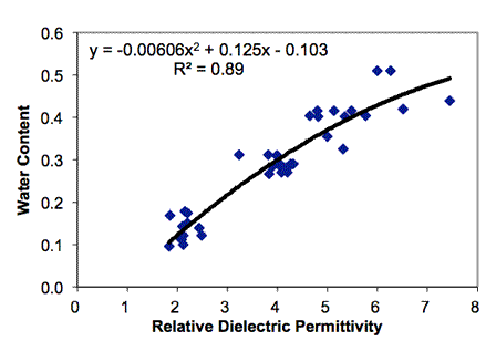 比誘電率は電磁波速度によってもとめられます。Kr=(c/v)2 この時cは光の速度をあらわします。土に関しては、Toppらの得た相関式が含水量を推測するのによく使われます。図4は、ウッドチップの重量を測定することで得られた含水量と、GPR測定による電磁波反射時間から導かれた比誘電率との関係を示したグラフです。