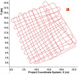 例えば、2つのシングルラインデータを2通りの方法でゴルフ場で収集しました(図1)。Line1は縦横方向に往復するやり方で(図1a)、Line2は中心からスタートしてらせん状に外に向かって進むやり方(図1b)です。