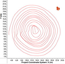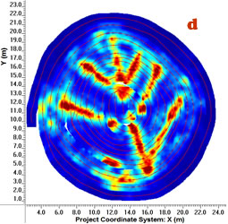 考古学に関するGPRデータで、深度スライスイメージ上に明瞭な円、四角形、線などがある場合は、それらが人工的なものであるという強いサインになります。