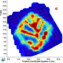 もう一つ、深度スライスビューに重要な設定値に、”Interpolation distance”があります。通常この値は、探査エリアにおける隣り合う探査ライン間隔の平均値が設定されます。グリッドを利用したデータ収集と同様、この隣り合う探査ライン間隔が狭くなればなるほど、最終的なイメージ図はより正確なものとなります。図1のライン間隔平均値は約1mです。図1のそれぞれの探査ラインにより得られた深度スライスイメージは、それぞれその下の図1cと1dになります。このイメージ図で樹木状にあらわれているのがゴルフ場グリーンの地下にある排水管です。