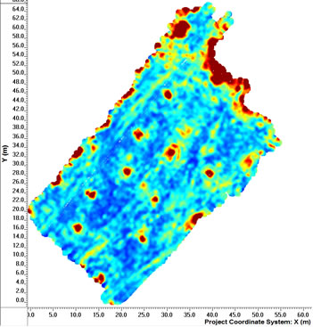 図3は深度約30cm付近のスライスで、規則的な高振幅パターンが見られます(赤で示された部分)。 当初の解析では、高振幅エリアはおそらく支持杭であり、低振幅エリアは土壌の部分であろうと見られていました。