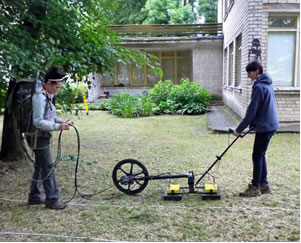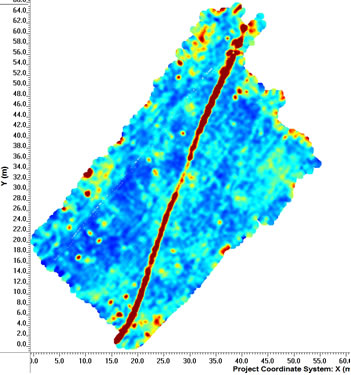 第1回目の調査は2015年夏にpulseEKKO地中レーダシステムを使用して行われました。(図1) 測線間隔0.25mで6グリッド、合計1,600平方メートルが調査されました。(図2)