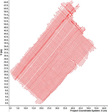 図4:データ収集測線。GPSの位置情報取得機能を利用することでグリッド設定よりも迅速にかつすべての探査範囲をスキャンできる。