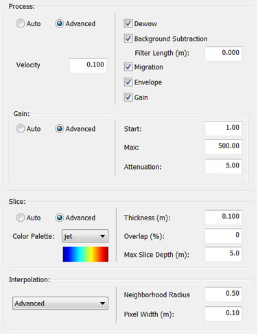Advancedを選択すると、ユーザーは値を入力することができます。この画面ではほとんどのパラメーターはデフォルトになっていますが、深度スライスビューに重要なパラメーターとして、探査エリアでのGPR速度があります。