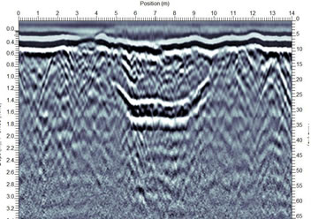地中レーダは、棺のような非金属の物質も探知可能なため、墓地の探査にもよく利用されます。また、棺はなく墓穴のみでも、掘削時の地盤の乱れを捉えることで検出できます。しかしながら、他の多くの探査でも同じ事が言えますが、データを解釈する上で偏見を持たないことが重要です。これは実際の結果が予測していたものと異なる可能性があるということです。