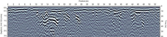 225MHzアンテナを使用し地下深度3m以上までを調査した結果、素晴らしい断面イメージが得られ(図3)、無傷で残る複雑な遺構の位置を確認することができました。