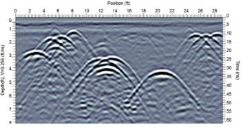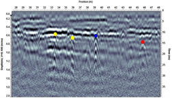 地中におおくの埋設物が表示された場合、深度ごと、方向ごとで区別したり、岩や木の根などの他の対象物とユーティリティを区別するなどの方法で対処することができます。図1は多くのターゲットが複雑に現れている断面図の例です。
