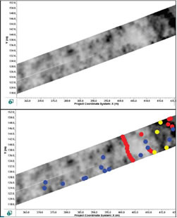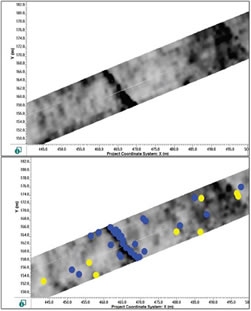 カラードットをマークしたら、EKKO_ProjectPCソフトを利用してMapViewを表示させます。そしてそこに表示されたカラードットのパターンを見てみます。(図9と図10)カラードットが一列に並んでいる場所であれば、線状の物体、おそらくユーティリティがあることを示しています。バラバラに存在するカラードットは、単体で存在するターゲットからの反応であり、ユーティリティ調査を行う際はあまり注目されません。付与したカラードットと深度スライスを重ねてみることで、深度スライスに現れた強い線状の反応は、カラードットを付与した強い双曲線と同じものなのか確認することができます。(図9)そしてさらに重要なのは、深度スライスにははっきりと現れない弱い双曲線からユーティリティを検出することです。(図10)深度スライスとカラードットを併用する方法は、見逃されがちな弱い反応を検出し、複雑な探査現場を解決するのに非常に役立ちます。安全にそしてユーティリティを破損しないことが第一条件です。難解なユーティリティ調査に直面した時には、出せる戦略をすべて使ってそれを解決していくことです。