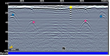 ユーティリティの位置調査の際、施工計画時の設計図等があればあらかじめその現場の状況を予測することができます。さらに通常、現場を撤収する前に、観察された特徴やターゲットのサイトマップを作成する必要があります。MapViewは実際の現場と同じ形状で探査データを表示することができます。このためには、データ収集の間、スクリーンをタッチしてカラードットをすべての反応(すべての双曲線)の頂上部分につけておきます(図3)。この最初の段階では、区別することなく、可能性のあるターゲットすべてにカラードットをマークします。この時注意すべきことは、データ収集の測線パターン、方向、間隔等がすべての探査エリアを正確にカバーできているかを確認することです。