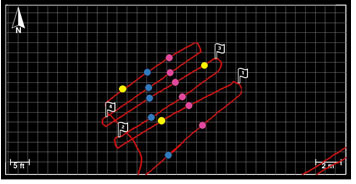 埋設ユーティリティは通常長い線状の特徴を示すので、MapView画面で線状に並んだカラードットがあるか確認することは、探査エリアの土質による反応と、ユーティリティからの反応を区別する有効な手段です。図3では、もっとも深い反応にピンク、中間部分の反応にブルー、浅い部分の反応に黄色のドットをマークしました。これをMapView画面で見ると、ブルーとピンクは明らかな線状を形成し、これらが埋設ユーティリティであると推測できます(図4)。黄色の反応は単発的に現れています。