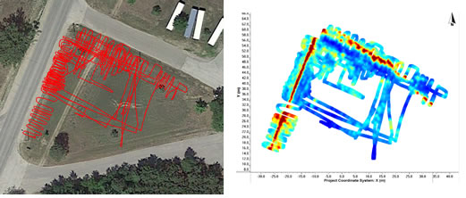 図6 位置情報に正確なGPSを使って疑似グリッドでデータを収集(左)。この方法でも異なる深度ごとにユーティリティを確認できる深度スライスを構築できる。