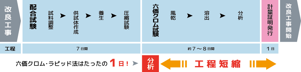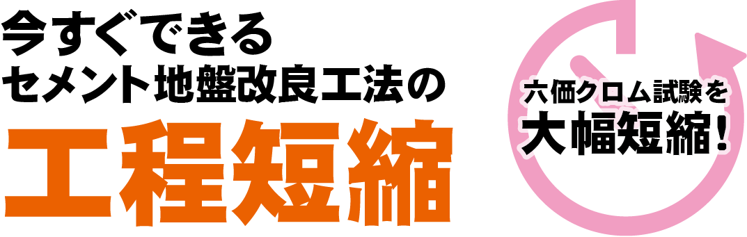 一般的なセメント改良工事ではセメント配合量を決定するために配合試験を実施し、土壌環境基準で定められる六価クロム溶出濃度の確定(公定法※による正規分析、計量証明の取得)まで、約3週間の施工待ちが避けられない状況です。しかし、この手待ち期間が短縮できれば、工程短縮だけでなく経費削減など様々な効果が得られます。