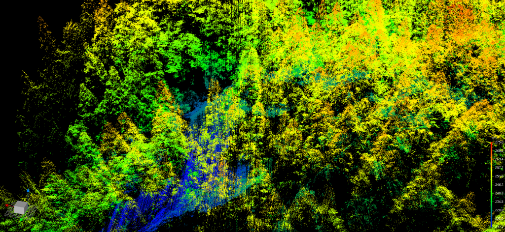 UAVレーザーには、LiDAR(ライダー)という計器が搭載されています。LiDARからレーザーが照射され、対象までの距離・反射強度を計測しています。毎秒何万~何十万と繰り返しレーザーを照射することで、広域のデータが迅速に得られます。また、地上から見上げて日差しが見えるところならデータを取得できるので、写真と違って草が生えていても、地表面が計測できます。写真が苦手とする傾斜地にはレーザーが向いています。さらに、地上点(基準点と検証点)の設置が少なく済むため広範囲の計測であるほど作業時間が短縮されます。なお、機体費用が高額なため「計測」だけでは写真より高額になります。
